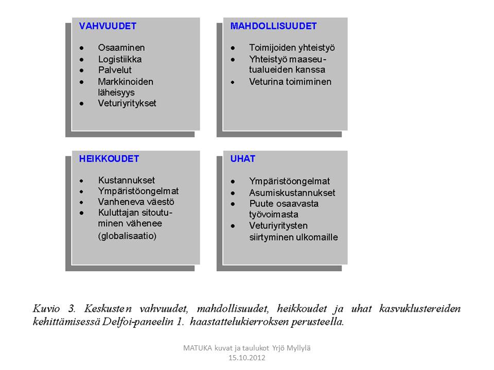 Keskusten heikkoutena ovat korkeat kustannukset, ympäristöongelmat, vanheneva väestö. Yksittäisinä mainintana mainittakoot myös kuluttajan sitoutumisen väheneminen nykyisiin tuotteisiin muun muassa globalisaation myötä (mahdollinen heikko signaali muutoksesta). Uhkina pidettiin ympäristöongelmia, asumiskustannuksia, puutetta osaavasta työvoimasta ja alueiden veturiyritysten siirtymisestä ulkomaille.