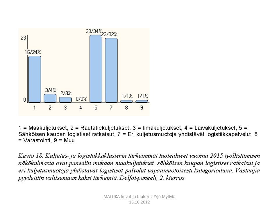 Kuljetus- ja logistiikkaklusterissa tärkeimmistä tulevaisuuden tuotealueista työllistämisen näkökulmasta panelistit olivat melko yksimielisiä (kuvio 18). Eniten korostuivat sähköisen kaupan logistiset ratkaisut ja eri kuljetusmuotojen yhdistävät logistiikkapalvelut. Lisäksi maakuljetukset korostuivat myös. Jälkimmäiseen sisältyy panelistien mukaan myös ns. tietointensiivinen logistiikka eli täsmäkuljettaminen. Pienikin paketti voisi sisältää tunnisteen ja ohjautuisi perille optimaalista reittiä eri kuljetusmuotoja yhdistellen.