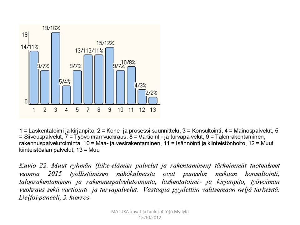 1 = Laskentatoimi ja kirjanpito, 2 = Kone- ja prosessi suunnittelu, 3 = Konsultointi, 4 = Mainospalvelut, 5 = Siivouspalvelut, 7 = Työvoiman vuokraus, 8 = Vartiointi- ja turvapalvelut, 9 = Talonrakentaminen, rakennuspalvelutoiminta, 10 = Maa- ja vesirakentaminen, 11 = Isännöinti ja kiinteistönhoito, 12 = Muut kiinteistöalan palvelut, 13 = Muu