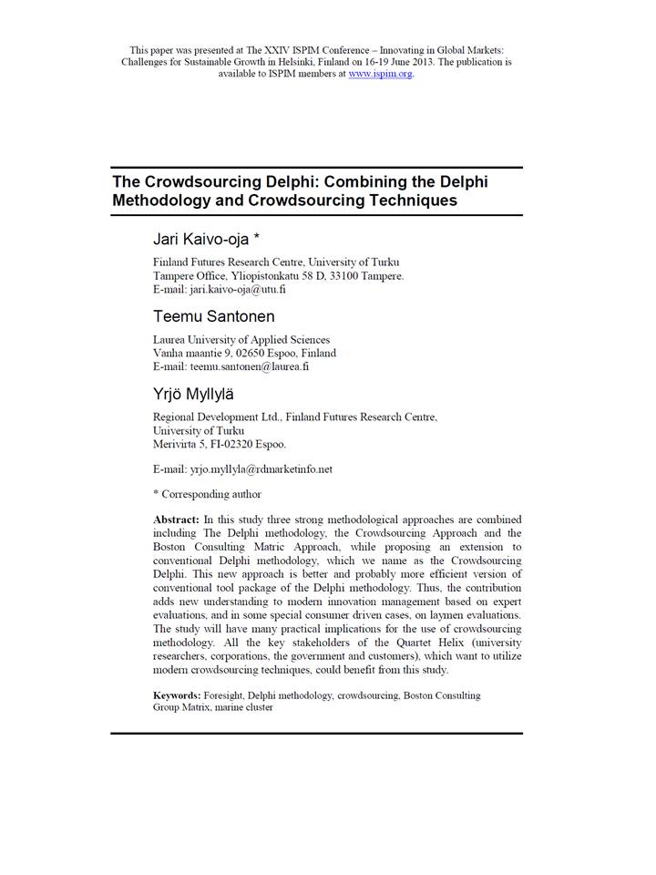 Kaivo-oja, Jari, Santonen Teemu, Myllylä, Yrjö (2013) The Crowdsourcing Delphi: Combining the Delphi Methodology and Crowdsourcing Techniques. This paper will be presented at The XXIV ISPIM Conference – Innovating in Global Markets: Challenges for Sustainable Growth in Helsinki, Finland on 16-19 June 2013. Session: 2.2 Strategic Foresight, Strategic Agility and Future Orientation (SIG) Special Session. The publication is available to ISPIM members at www.ispim.org.