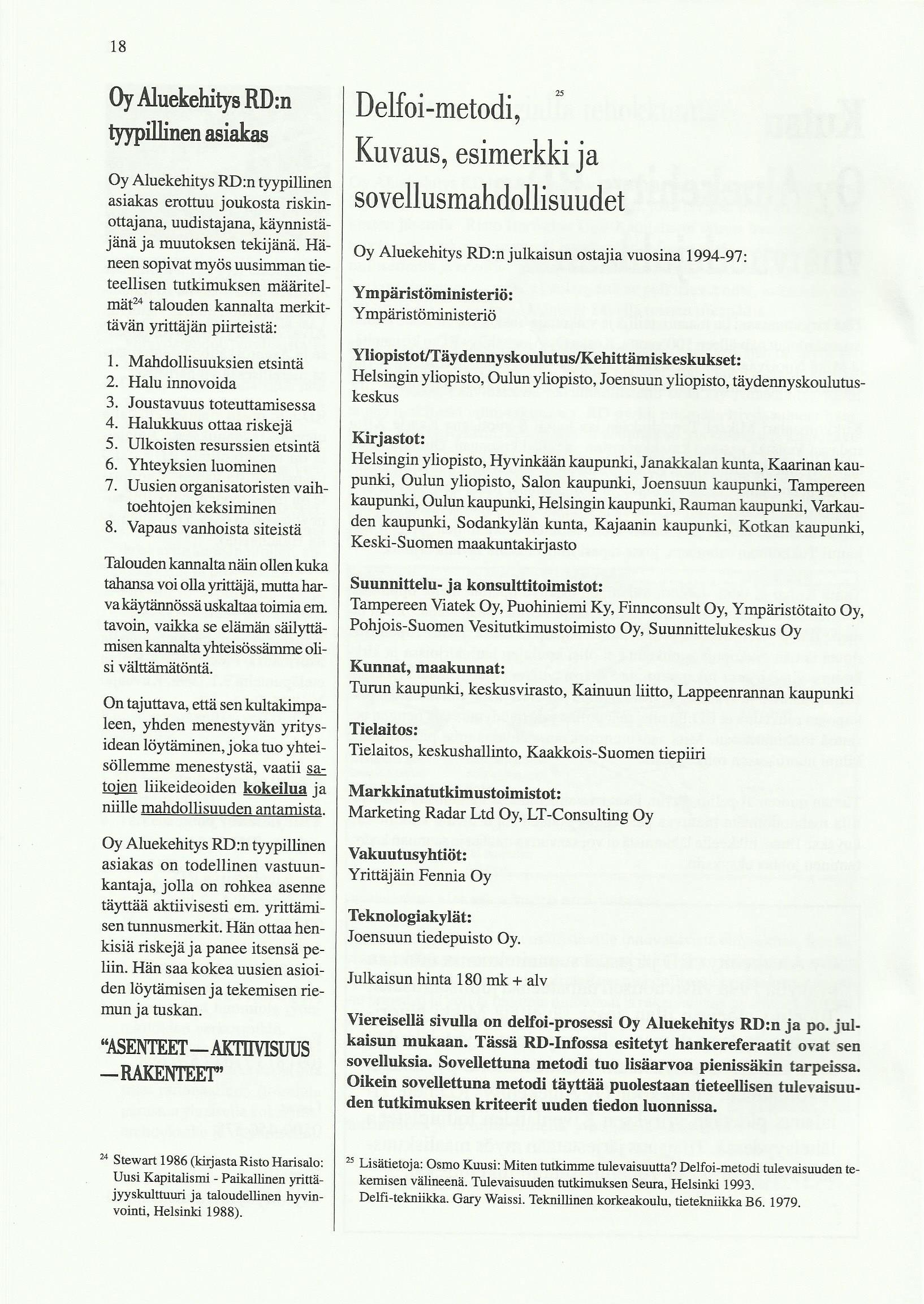 ”RD Aluekehitys Oy:n tyypillinen asiakas erottuu joukosta riskinottajana, uudistajana ja muutoksen tekijänä. Häneen sopivat myös uusimman tieteellisen tutkimuksen määritelmät* talouden kannalta merkittävän yrittäjän piirteistä: