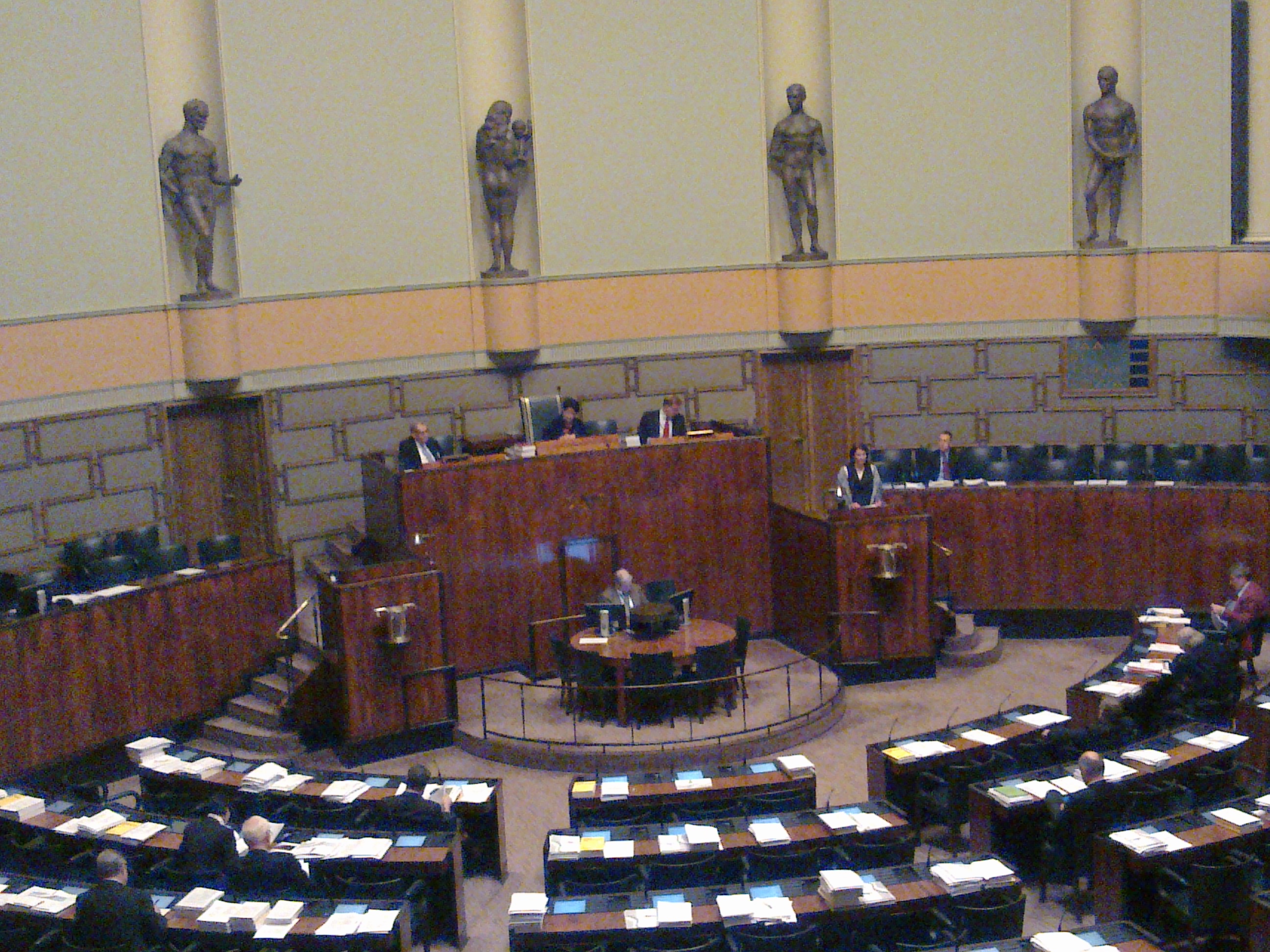 Eduskunnan suuri sali 9.12.2010. Käsittelyssä Sopimusten Venäjä 2030 -skenaatiot. Puhumassa pääministeri Mari Kiviniemi ja kuuntelemassa ministeriaitioissa Aleksander Stubb. Raporttiin oli implementoitu Murmansk tutkimuksen tuloksia yrittäjä Yrjö Myllylän toimesta. (TuV 3/2010). Kuva YMy.