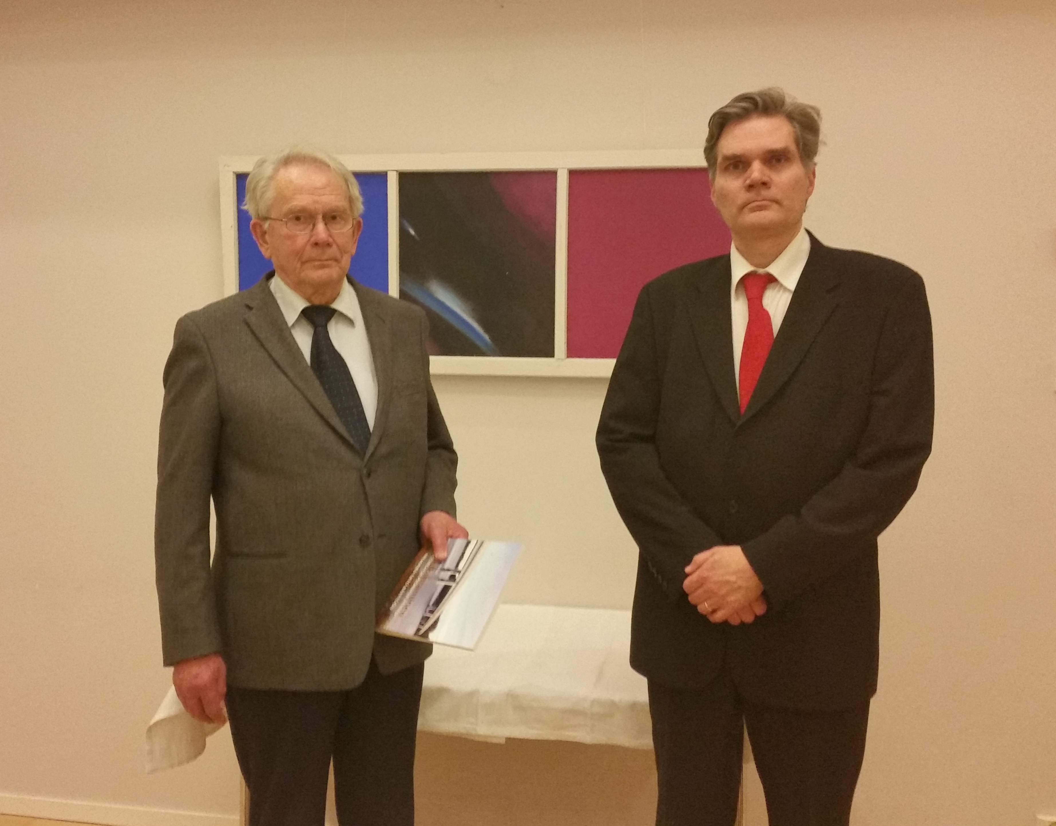Oulun 1. Rotuvaari Mauri Myllylä vasemmalla Vaikuttaminen kävelyn ja pyöräilyn hyväksi -kirjan esittelytilaisuudessa 21.2.2015 Pyhän Luukkaan kappelissa. Oikealla kirjan kustantajana toimineen RD Aluekehitys Oy:n edustaja Yrjö Myllylä.