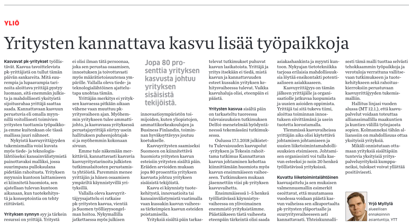 Myllylä, Yrjö (2018). Yritysten kannattava kasvu lisää työpaikkoja. Maaseudun Tulevaisuus, Yliökirjoitus, 5.3.2018. <https://www.maaseuduntulevaisuus.fi/mielipiteet/artikkeli-1.226589> pdf: Yliö, MT 5.3.2018.