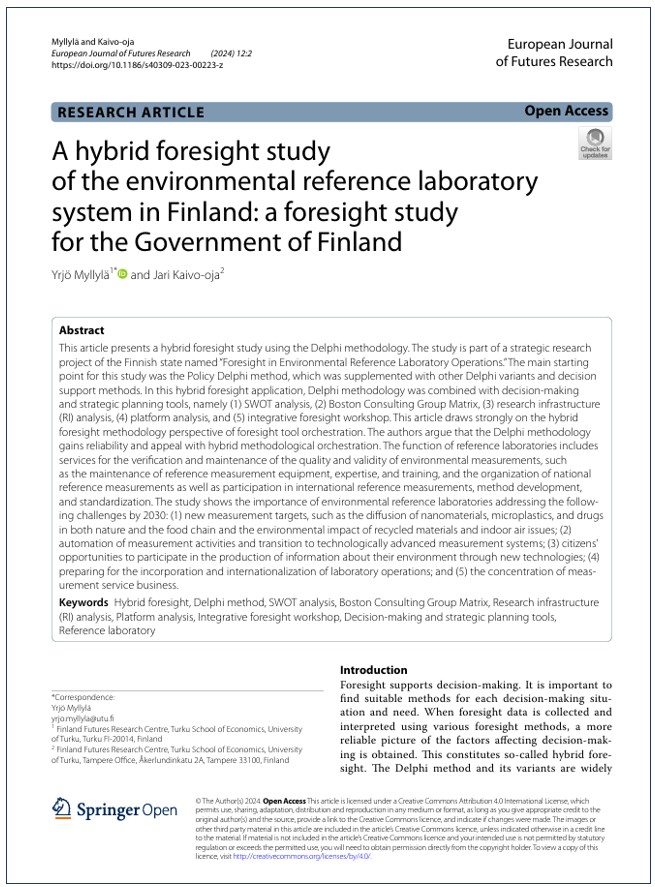 Myllylä, Yrjö, Jari Kaivo-oja (2024). A Hybrid Foresight Study of the Environmental Reference Laboratory System in Finland: A Foresight Study for the Government of Finland. European Journal of Futures 12(2). ©Springer. https://doi.org/10.1186/s40309-023-00223-z