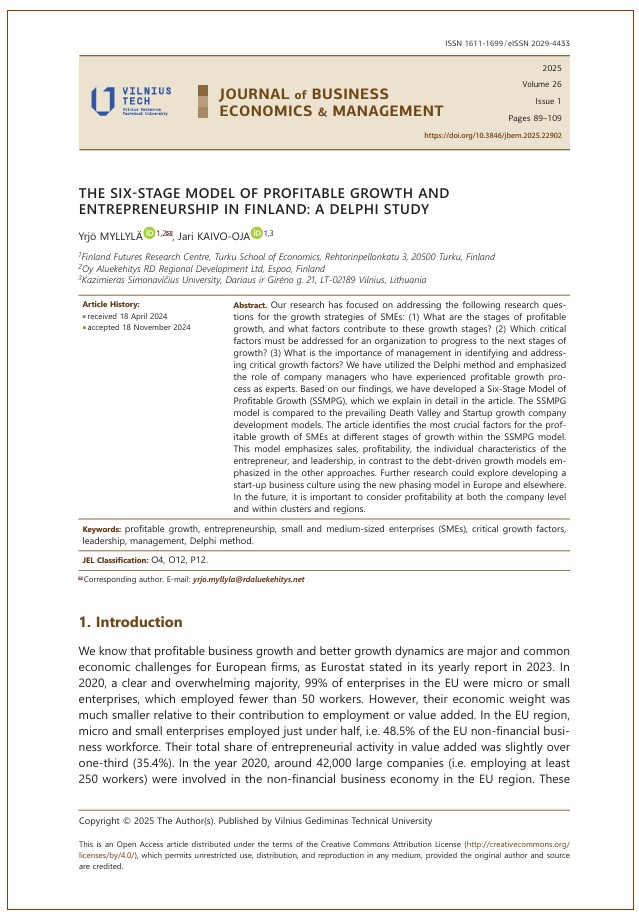 Myllylä, Y., & Kaivo-oja, J. (2025). The six-stage model of profitable growth and entrepreneurship in Finland: a Delphi study. Journal of Business Economics and Management, 26(1), 89–109. https://doi.org/10.3846/jbem.2025.22902 .
